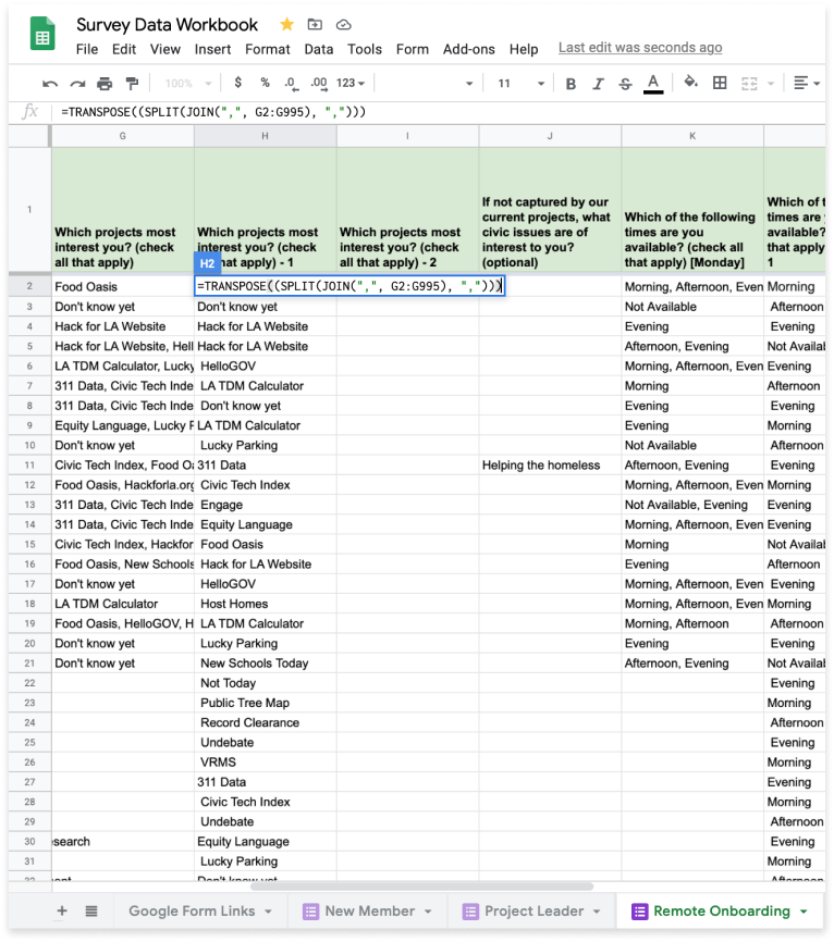 We use the TRANSPOSE() function with the SPLIT() and JOIN() functions to achieve this outcome. In our example, we enter the formula =TRANSPOSE((SPLIT(JOIN(“,”, G2:G995), “,”))) in cell H2.
